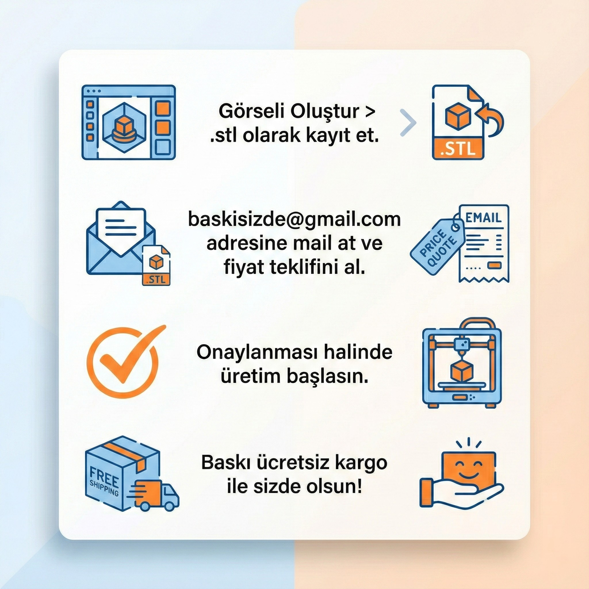 Tasarladığınız modeli .STL olarak bize gönderin; hızlı fiyat teklifi, kusursuz üretim ve ücretsiz kargo ayrıcalığıyla premium 3D baskı deneyimini yaşayın. Her katmanda özen, her detayda kalite - hayaliniz özel bir ürüne dönüşsün.
